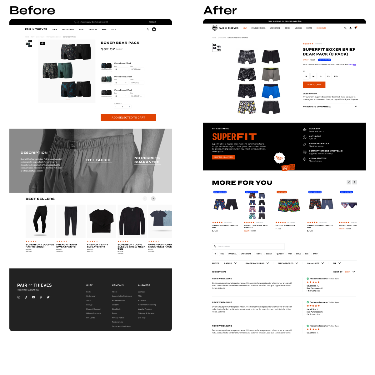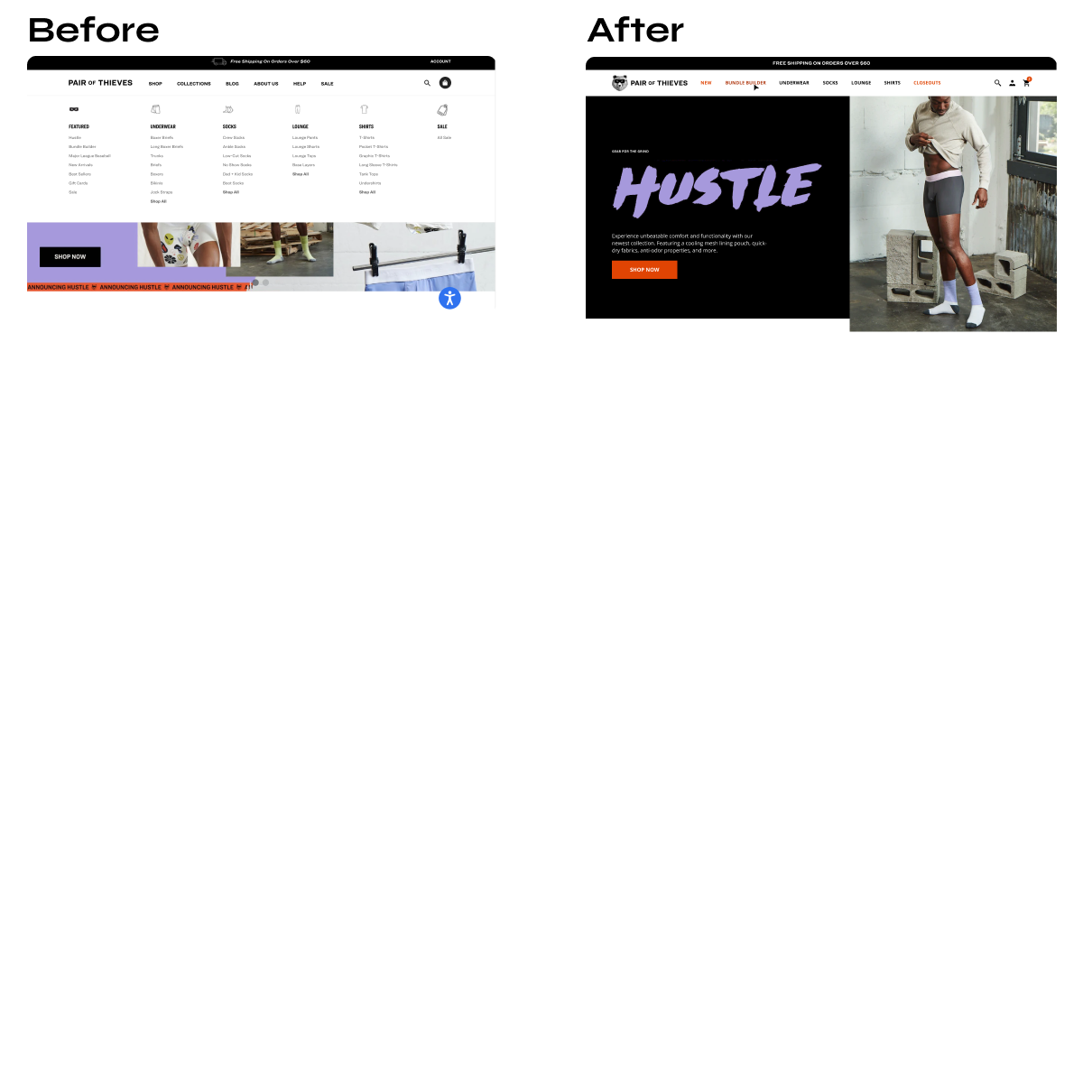 Our goal was to make Bear Packs and bundles core items that are easy to shop anywhere on the Pair of Thieves' site—including dedicated homepage space, in the navigation, and throughout product landing pages. This would result in new and return customers to be more familiar with these items and, in time, increasing sales.